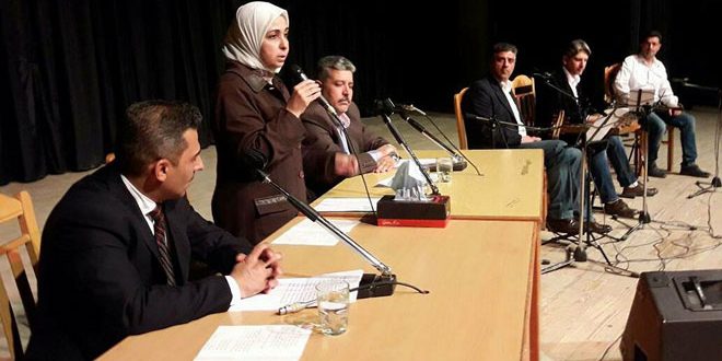 أما الشاعرة سمر تغلبي فألقت قصيدة بعنوان ونطق الجمال قدمت فيها وصفا جميلا لتفاصيل موجودة في قصري العظم بحماة ودمشق ظهر فيها الرابط الجميل الذي يربط الشاعرة بالقصرين وقالت “ما بين قصرين بات القلب مرتحلا … يا درتين صدى الأجداد قد حملا أطلقت آهي في شامي فرددها … صوت النواعير حبا مغدقا ثملا”.