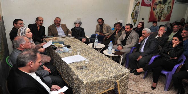 عدد من الأدباء والنقاد والباحثين والفنانين التشكيليين وفدوا إلى صالة حزب الشعب في مخيم جرمانا ليشاركوا في الندوة التي أقامها الحزب بالتعاون مع دار فلستينا للطباعة والنشر والتوزيع حول المجموعة القصصية “أطفال في زمن الحرب” للأديبة نبوغ محمد أسعد.