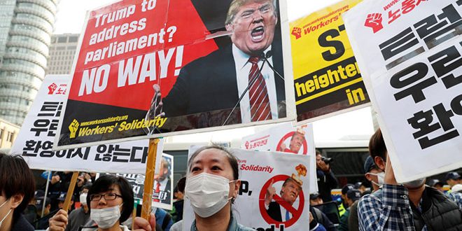 تظاهر مئات الأشخاص اليوم في العاصمة الكورية الجنوبية سيئول احتجاجا على زيارة الرئيس الأمريكي دونالد ترامب للبلاد.