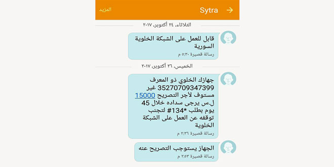 وفي توضيح حول الأمر من الدكتور إباء عويشق مدير عام الهيئة الناظمة لقطاع الاتصالات لمندوبة سانا أشار إلى أن الشخص الذي يتعرض لهذه المشكلة “قد يكون وضع شريحة خطه في البداية ضمن الجهاز الذي اشتراه وأعاد وضعها في جهاز آخر ثم أعادها لجهازه الأول فوصلته رسالتان متضاربتان لذلك عليه أن يطابق الإيمي الخاص بالجهاز (IMEI) مع الإيمي المرافق للرسالة المرسلة”.