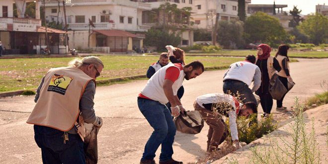 بمناسبة اليوم الوطني للبيئة نظمت فعاليات رسمية وأهلية في مدينة بانياس بطرطوس اليوم حملة نظافة تطوعية شملت مختلف الأحياء وتضمنت تنظيف الشوارع من الأوساخ وترحيل الأنقاض والقمامة.