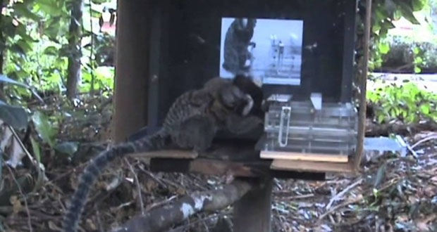 وذكر موقع قناة روسيا اليوم أنه من أجل معرفة ذلك قامت تينا جونهولد من جامعة فيينا بالنمسا مع زملائها بتصوير قرد أميركي يحاول الحصول على قطعة طعام من داخل جهاز من البلاستيك ثم أخذوا الجهاز إلى غابات الأطلسي في البرازيل وتم عرضه أمام قرد بري بالغابات الموجودة واستطاع من خلال رؤيته للفيلم تقليد القرد الآخر وتعلم كيفية استخراج الطعام من جهاز البلاستيك بسرعة ومهارة مدهشة.