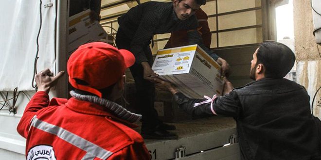 بإشراف الهلال الأحمر العربي السوري وصلت إلى مدينة دوما في غوطة دمشق الشرقية أمس قافلة مساعدات إنسانية إلى الأهالي الذين تحتجزهم المجموعات المسلحة وتتخذ منهم دروعا بشرية.