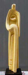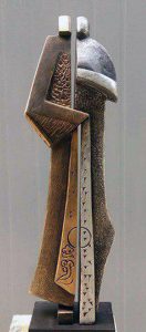 أما العمل الثاني فجاء تمثيلاً للشخصية العربية بحركتها ورصانتها وملامح لباسها وبأسلوب ملخص ومبسط يعطي الكتلة حضورها وقوتها فكان بارتفاع 60 سم وبخامة الريزين.