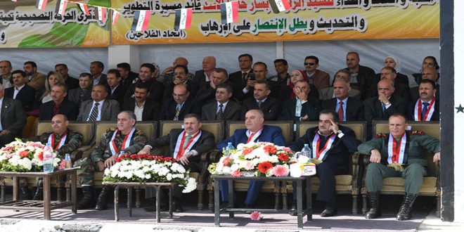واستعرض رئيس اتحاد فلاحي المحافظة عبدو العلي في كلمته الانجازات التي تحققت في ظل الحركة التصحيحية في القطاع الزراعي مؤكداً استمرار الفلاحين بالعمل بمختلف المحاصيل الزراعية لدعم الاقتصاد الوطني وتعزيز الأمن الغذائي الوطني .