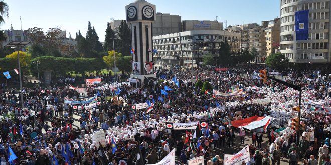 من جهتهم أوضح عدد من المواطنين أن مشاركتهم في فعالية اليوم هي للتأكيد على صمود الشعب السوري خلف جيشه وقيادته الحكيمة حتى تحقيق النصر على الإرهاب وعودة الأمن والاستقرار إلى ربوع الوطن وإعادة إعمار سورية القوية المتجددة ووفقا لنهج التصحيح كونه إرادة شعبية وحاجة وطنية وقومية.