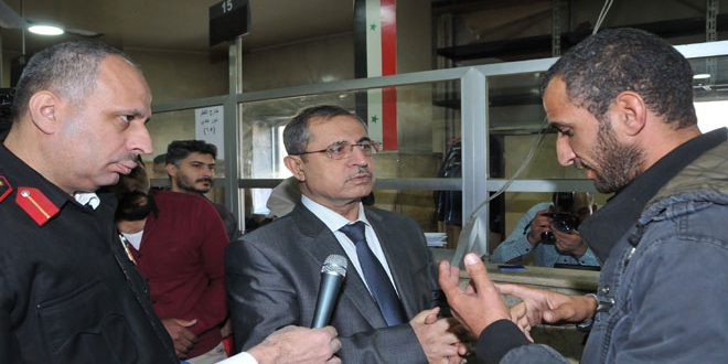 وشدد وزير الداخلية خلال جولة تفقدية له في فرع الهجرة والجوازات بدمشق على السرعة في إنجاز معاملات المواطنين والتقيد بنظام الدور المعمول به سواء العادي أو المستعجل خلال الحصول على جواز السفر للمقيمين والمغتربين وإنجاز بطاقات الإقامة المتعلقة بالعرب والأجانب وفق القوانين والأنظمة النافذة.