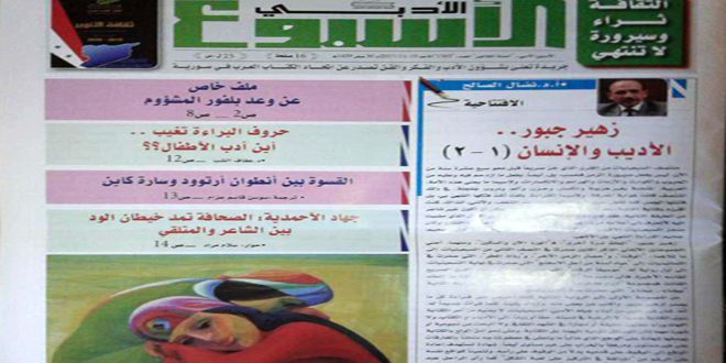وفي افتتاحيته كتب رئيس اتحاد الكتاب العرب الدكتور نضال الصالح مقالا بعنوان “زهير جبور الأديب والإنسان” رصد فيه تداعيات وتحولات الأديب جبور منذ منتصف السبعينيات حتى الوقت الراهن وفق قراءة منهجية نقدية أظهرت ميزات الأديب الإيجابية وأسباب تكريمه الذي تم في الأسبوع الماضي.