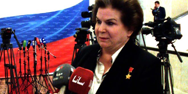 وأشارت رائدة الفضاء السوفييتية عضو مجلس الدوما الروسي فالنتينا تيرشكوفا في مقابلة مع مراسل سانا في موسكو إلى العلاقات التاريخية والودية بين روسيا وسورية وقالت إن “ما جرى ويجري في سورية ليس طبيعيا بالنسبة لنا كشعب روسي ومن هنا كانت المبادرات الروسية لرفع الظلم عن سورية وتأسيس حملة تعاون عسكري في سبيل مكافحة الإرهاب”.