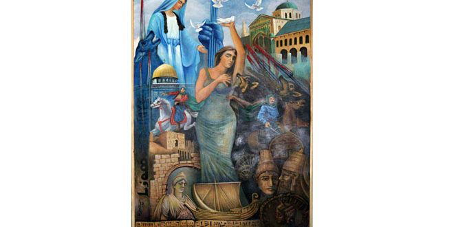 تشكل لوحة “سورية الأم” التي أنجزها مؤخرا الفنان التشكيلي حسن حمدان تجسيدا لقيم المحبة والجمال والسلام في سورية حيث ضمنها دلالات ورموز تحكي قصة الحضارة الإنسانية السورية التي تكالب عليها المجرمون لكنها صمدت لأن رسالة الحق والنور والسلام أقوى من شرورهم.