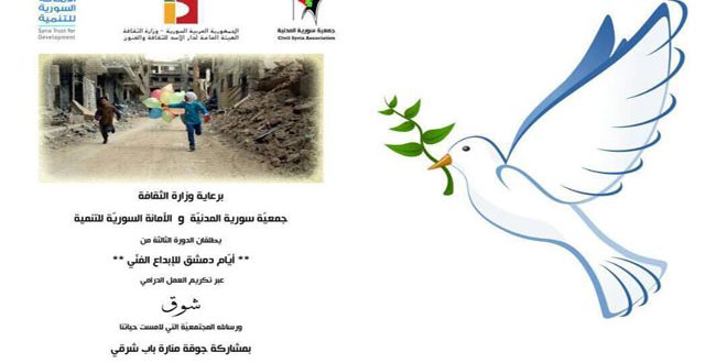 تطلق جمعية سورية المدنيّة بالتعاون مع الأمانة السورية للتنمية عند الساعة 6 من مساء يوم الأربعاء القادم الدورة الثالثة من “أيام دمشق للإبداع الفني” وذلك على مسرح الأوبرا في دار الأسد للثقافة والفنون.