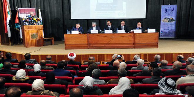من جهته جدد السفير الجزائري بدمشق صالح بوشة موقف بلاده الداعم للقضية الفلسطينية باعتبارها القضية المحورية للشعب الجزائري الذي عانى من احتلال استيطاني مماثل مشدداً على ضرورة وجود نظرة موحدة لدى الأمة العربية تقوم على دراسة الأوضاع الراهنة بالنظر إلى التحولات السريعة في المجتمعات وبناء فكر جديد ونشر المعرفة.