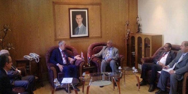 بحث وزير الصناعة المهندس أحمد الحمو مع السفير السوداني بدمشق خالد أحمد محمد علي آليات الاستفادة من الامكانيات الاقتصادية المتوفرة في البلدين للدخول في مشاريع صناعية مشتركة ومتبادلة وتفعيل عمل اللجنة المشتركة للتعاون الصناعي بما ينعكس بالفائدة على اقتصاديي وشعبي البلدين الشقيقين.