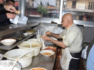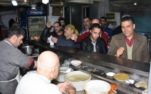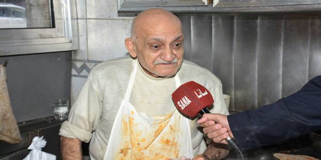 عبد الرزاق مصري المعروف بالحاج عبدو يروي لمراسل سانا من داخل محله المكتظ بالزبائن كيف يقضي يومه الذي يبدأ في تحضير الفول ومكملاته من طحينة وحمض وخضار وتوابل وغيرها حيث يذهب إلى المحل في الساعة السادسة صباحا ويستمر بالعمل لأكثر من عشر ساعات وقال “اعمل متواصلا منذ 62 عاما وعندما لا اعمل أتعب”.