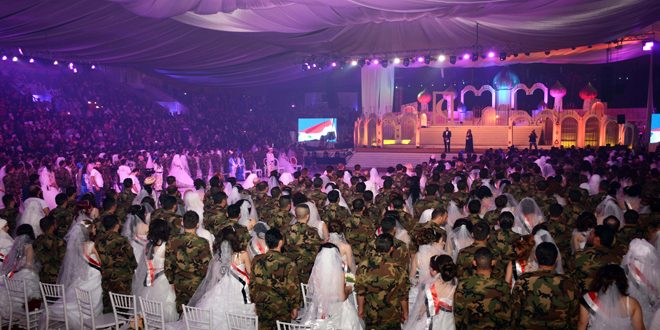 آلاف العيون توجهت إلى المسرح الضخم الذي أنشئ خصيصا لإحياء فعاليات الحفل وكان منبرا أيضا لدخول العرسان إلى الصالة بمراسم ملكية الطابع ساهمت بها الموسيقا والإضاءة والديكورات التي لم تترك ركنا واحدا من الصالة إلا وشملته ليتكلل المشهد بدخول بهي للعرسان ببدلاتهم العسكرية التي أصروا على ارتدائها في يومهم المنشود التزاما منهم بالرسالة السامية التي يجسدها هذا الرداء الغالي على قلوبهم وظهرت الشابات قربهم بأبهى حلة متوشحات بعلم الجمهورية العربية السورية الذي زين لباسهن الأبيض النقي حتى ان بعضهن فضلن ارتداء فساتين بألوان العلم السوري ونجومه ليشكل الجميع لوحة وطنية ألهبت مشاعر أكثر من ستة آلاف متفرج خفقت قلوبهم ودمعت عيونهم لروعة المشهد وجلال اللحظة.
