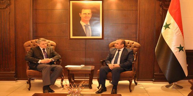 بحث وزير الإدارة المحلية والبيئة المهندس حسين مخلوف مع سفير جمهورية بيلاروس في دمشق ألكسندر بانوماريف سبل تطوير التعاون الثنائي في المجالات الإنسانية والخدمية وإمكانية توريد آليات ثقيلة.