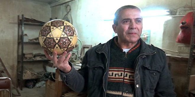 حرفي سوري يصمم كرة قدم خشبية مرصعة