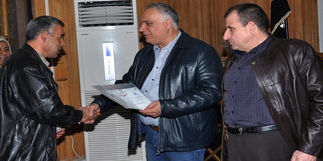 حضر حفل التكريم نديم علي رئيس مكتب الفلاحين في فرع حمص لحزب البعث العربي الاشتراكي.