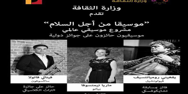 ضمن إطار الدورة الحادية عشرة للمهرجان الدولي أطفال السلام تحتضن وزارة الثقافة ضمن مشروع الموسيقا العالمي امسية موسيقية وذلك عند الساعة السادسة من يومي الأحد والاثنين المقبلين بعنوان “موسيقا من أجل السلام” وذلك على خشبة مسرح الدراما بدار الأسد للثقافة والفنون.