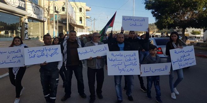 احتشد مئات الفلسطينيين اليوم في مدينة سخنين بالجليل المحتل تنديدا ورفضا لقرار الرئيس الأمريكي دونالد ترامب غير الشرعي بشأن مدينة القدس واعترافه بها كعاصمة لكيان الاحتلال الإسرائيلي مؤكدين أنها ستبقى عربية وعاصمة لفلسطين إلى الأبد.