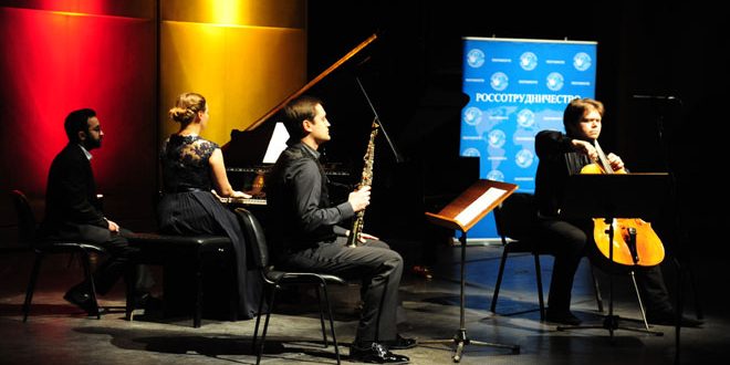 وقدم الموسيقيون ماريا نيمتسوفا على آلة “البيانو” وفيتالي فاتولا على آلة “الساكسفون” ويفغيني روميانتسيف على آلة “التشيلو” أعمالا كلاسيكية لمؤلفين روس وفرنسيين وألمان كبار.