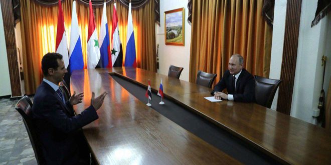 وأشار الرئيس الأسد إلى أن زيارة الرئيس بوتين إلى سورية تشكل فرصة للتباحث في المرحلة الثانية من مكافحة الإرهاب وفي الوقت نفسه البحث في العملية السياسية في سورية، معتبراً أن الإنجازات الكبيرة التي تحققت على صعيد محاربة الإرهاب تفتح المجال واسعاً أمام تفعيل العمل السياسي وإيجاد حل سلمي يحقن دماء السوريين ويعيد الأمان إلى ربوع وطنهم.