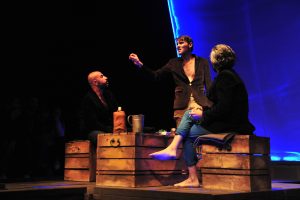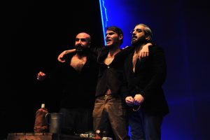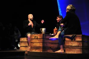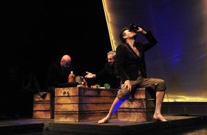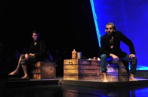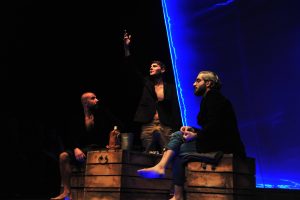 التجربة التي قدمها المعهد في فصله الدراسي الأول من هذا العام بدت أقرب إلى مسرح اللامعقول من حيث اعتماد المخرج على أسلوب الغروتيسك والذي يمزج بين ظاهر مرح وكوميدي وباطن مأساوي عنيف عكست قالباً عبثياً لشخصيات العرض متكئة على تقنيات مسرح الحكي مع الإبقاء على هيكل النص الأصلي في أعالي البحار حيث نشاهد ثلاثة رجال يقطعون رحلتهم نحو المجهول فوق طوف خشبي وليكون الجمهور شاهداً على تباينات حادة في الشخصيات الثلاث حيث هناك الانتهازي والرومانسي والعضلي الأهوج.