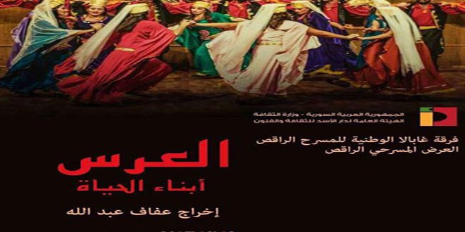 تقدم فرقة “غابالا” الوطنية للمسرح الراقص عند الساعة السادسة من مساء يوم غد الأربعاء عرضا مسرحيا راقصا بعنوان “العرس أبناء الحياة” إخراج عفاف عبد الله وذلك على خشبة مسرح الدراما بدار الاسد للثقافة والفنون.