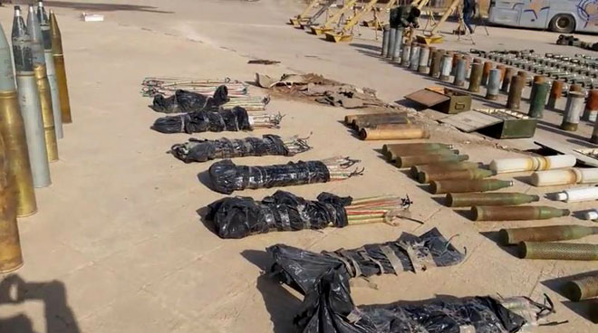 وبين المراسل أن الأسلحة والذخائر تضم 1200 قذيفة هاون عيار 120 ومدفع 37 ورشاش 7ر12 و3 قواذف هاون مع قواعدها وألغاماً مضادة للآليات ومواد شديدة الانفجار و7 صواريخ مالوتكا و68 قذيفة صاروخية محلية الصنع وأحزمة ناسفة وعبوات و100 صمام قذائف.