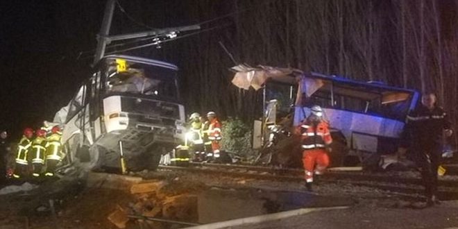 وكانت شركة السكك الحديدية الوطنية الفرنسية أعلنت في وقت سابق اليوم مقتل اربعة طلاب واصابة 20 شخصا اخرين عندما صدم قطار حافلة مدرسية خارج بلدة بربينيا جنوب غرب فرنسا أمس.