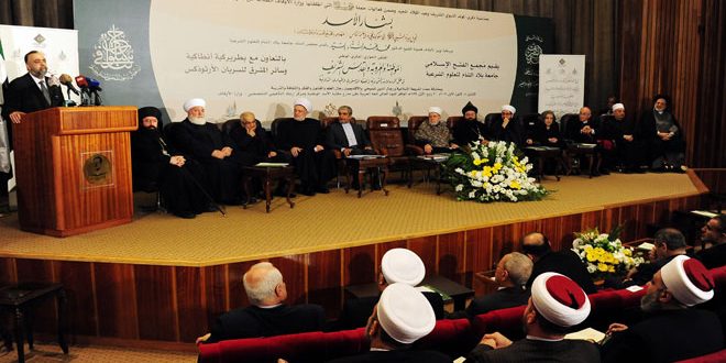 جاء ذلك خلال افتتاح فعاليات الملتقى الحواري الفكري الوطني بعنوان “المواطنة والعروبة والقدس الشريف في ظل الرسالات السماوية والفقه الدستوري والمبادىء الدولية” الذي تقيمه وزارة الأوقاف “جامعة بلاد الشام للعلوم الشرعية.. فرع مجمع الفتح الإسلامي” بالتعاون مع بطريركية أنطاكية وسائر المشرق للسريان الأرثوذكس وذلك في مكتبة الأسد الوطنية بدمشق.