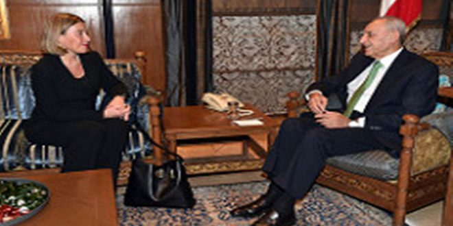 بحث رئيس مجلس النواب اللبناني نبيه بري خلال لقائه في بيروت اليوم مفوضة السياسة الخارجية والأمن في الاتحاد الأوروبي فيديريكا موغيريني الأوضاع في لبنان والمنطقة.