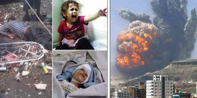 ويواصل النظام السعودي وتحالفه عدوانا دمويا على اليمنيين منذ آذار عام 2015 تسبب بازهاق أرواح عشرات الآلاف من المدنيين وبدمار وخراب هائلين في البنية التحتية لليمن إضافة إلى انتشار المجاعة والأوبئة وخاصة وباء الكوليرا مع الحصار الذي يفرضه على الموانىء اليمنية ومطار العاصمة صنعاء.