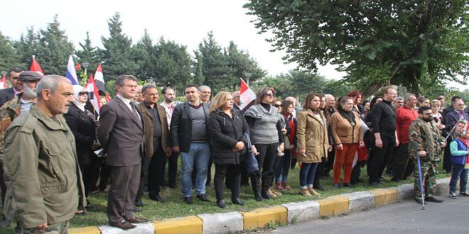 وردد المشاركون عبارات تمجد الشهيد وتتغنى بحب الوطن رافعين أعلام الوطن وصور عدد من أبنائهم الشهداء مؤكدين أن الشهداء الذين بذلوا دماءهم في سبيل الوطن سيبقون أحياء في ضمائر السوريين الشرفاء وستخلد أسماءهم الأجيال فهم “أكرم من في الدنيا وأنبل بني البشر”.