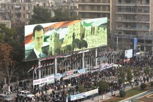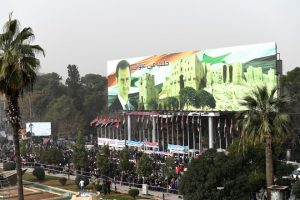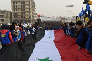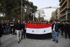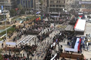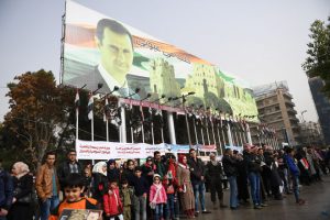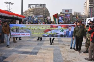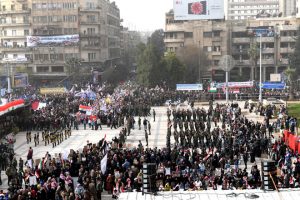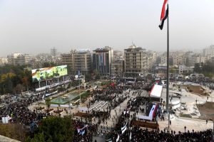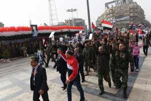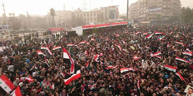 وتجمع الآلاف من أهالي حلب في الشوارع المؤدية للساحة حاملين الأعلام الوطنية وصور السيد الرئيس بشار الأسد ومرددين هتافات تؤكد صمودهم ووقوفهم خلف الجيش العربي السوري في مواجهة الإرهاب حتى تحقيق النصر النهائي وإعادة الأمن والاستقرار إلى كامل الأراضي السورية.