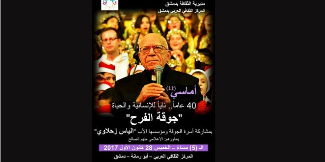 تختتم أماسي موسم 2017 بنسختها الحادية عشرة عند الخامسة من مساء الخميس المقبل بندوة حوارية حول جوقة الفرح بمشاركة مؤسسها الأب الياس زحلاوي في ثقافي أبو رمانة.