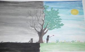 اليافعة آراز بدوريان الفائزة بالمركز الأول للفئة العمرية بين 13 و15 عاما عرضت في لوحتها الطبيعة في حالتين متناقضتين تظهر مدى تأثير الإنسان عليها وواجبه بالاهتمام بمكوناتها لضمان استمرار الحياة للأجيال القادمة.
