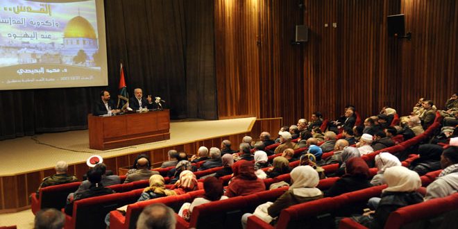 وبين البحيصي خلال محاضرة بعنوان “القدس وأكذوبة القداسة عند اليهود” نظمتها مؤسسة القدس الدولية/سورية بمناسبة يوم القدس الثقافي في مكتبة الأسد زيف الادعاءات الصهيونية حول المدينة مشددا على ضرورة إبراز أهمية القدس وأن الفلسطينيين هم أصحاب الأرض ولا يمكن التفريط بها معتبرا كل القرارات التي تعارض الحق الإسلامي والعربي قرارات عدوانية تتناقض مع القانون والإجماع الدولي.
