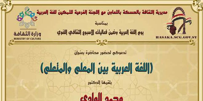 أقامت مديرية الثقافة واللجنة الفرعية للتمكين للغة العربية في الحسكة اليوم محاضرة بعنوان “اللغة العربية بين المعلم والمتعلم” وذلك في المركز الثقافي العربي بمدينة الحسكة.
