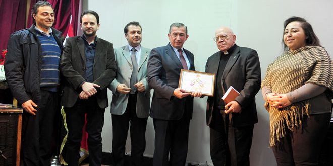 وبعد ذلك قدم معاون الوزير ومدير ثقافة دمشق الدكتور أيمن ياسين شهادة تقديرية للأب زحلاوي على ما قدمه منذ تأسيس الجوقة.