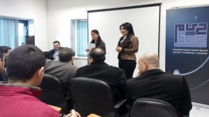 كذلك استعرض أحمد حمدان الطالب في برنامج الميكاترونيك لخريجي مركز المتميزين خطوات مشاركته في المسابقة ضمن فئة السومو روبوت شارحا تعليمات وشروط ومواصفات الروبوتات الخاصة بهذه الفئة ليتولى محمد مصطفى عرج الطالب في هندسة الميكاترونيك بجامعة تشرين تقديم تجربته ضمن الفئة المفتوحة وآليات تطوير مشروعه الخاص بمساعدة ضحايا الحرب الإرهابية على سورية.