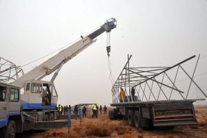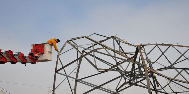 تواصل ورش الصيانة التابعة لوزارة الكهرباء عمليات إصلاح برج توتر عال 230 كيلو فولط التابع لخط تشرين الكوم والمغذي لمحافظة السويداء وذلك بالقرب من منطقة الهيجانة بريف دمشق بعد ان استهدفته التنظيمات الإرهابية المسلحة أمس بعدد من القذائف الصاروخية ما تسبب بانهياره.