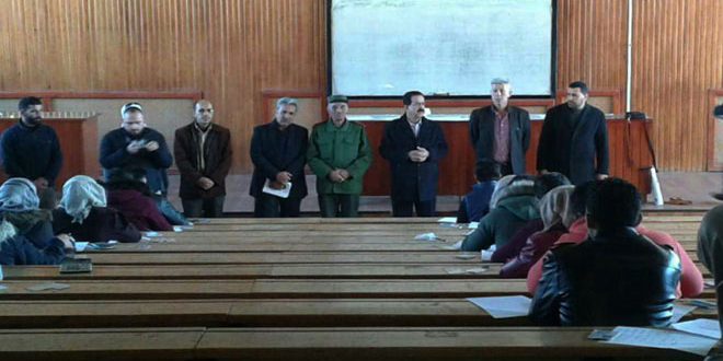 وتلا الاجتماع جولة للمحافظ في فرع جامعة دمشق بالقنيطرة للاطلاع على سير العملية الامتحانية للفصل الدراسي الاول في كليتي الحقوق الثالثة والاقتصاد الثالثة والمعهد التقاني الزراعي.