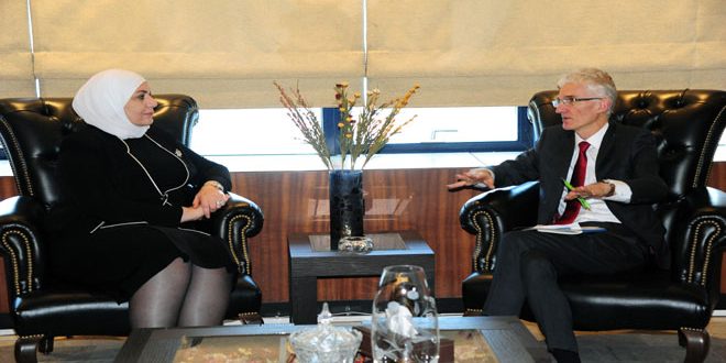 بحث وزيرا الصحة الدكتور نزار يازجي والشؤون الاجتماعية والعمل ريمه قادري كل على حدة مع وكيل الأمين العام للأمم المتحدة للشؤون الإنسانية ومنسق الإغاثة الطارئة مارك لوكوك آفاق التعاون مع منظمات الأمم المتحدة العاملة في مجال العمل الإغاثي والإنساني ووصول الخدمات الطبية لجميع المناطق.