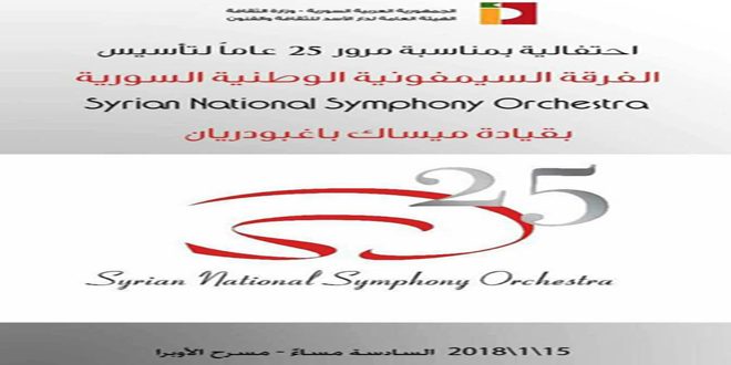 ضمن أمسية موسيقية تحمل طابعا خاصا تحتفي الفرقة السيمفونية الوطنية السورية بقيادة المايسترو ميساك باغبودريان عند الساعة السادسة من مساء يوم الاثنين المقبل بالذكرى الـ 25 عاما لتأسيسها وذلك على خشبة مسرح الأوبرا بدار الأسد للثقافة والفنون.