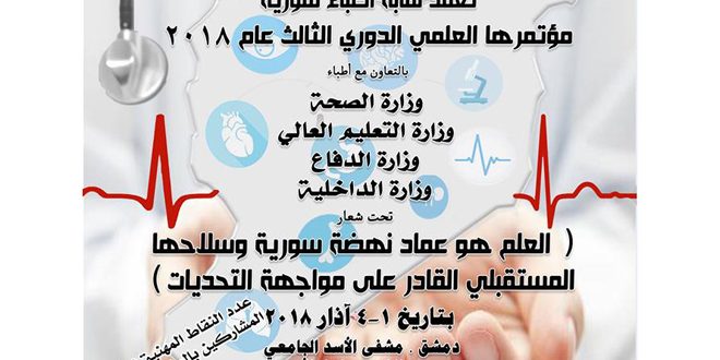 أعلنت نقابة أطباء سورية عن مؤتمرها العلمي الدوري لعام 2018 وذلك بين 1 و 4 آذار القادم بمشفى الأسد الجامعي ويطرح نحو 25 محورا للمناقشة.