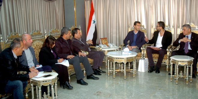 بحث محافظ اللاذقية ابراهيم خضر السالم اليوم مع نائب رئيس بعثة اللجنة الدولية للصليب الأحمر في سورية جون نيكولا سبل تعزيز التعاون المشترك في مجال تقديم الخدمات للمواطنين عبر مشاريع مستدامة وتحسين سبل العيش للمهجرين العائدين إلى قراهم ومناطقهم في الريف الشمالي.