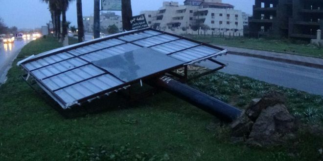 أدت الأحوال الجوية السائدة جراء المنخفض الجوي المصحوب بأمطار غزيرة ورياح قوية الذي تتعرض له سورية منذ يوم أمس إلى الحاق أضرار في المزروعات والمنازل وشبكات الكهرباء في عدد من المحافظات إلى جانب توقف حركة الملاحة البحرية في موانئ نتيجة ارتفاع الأمواج حيث كانت ذروة العاصفة ليلا وتجاوزت سرعة الرياح في بعض الأحيان 85 كم/سا.
