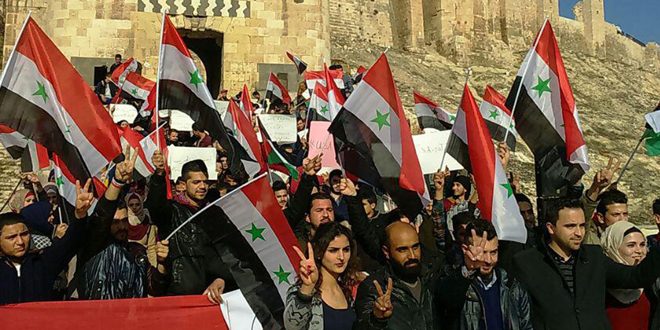 نظم فرع الاتحاد الوطني لطلبة سورية بجامعة حلب اليوم وقفة تضامنية أمام قلعة حلب دعما لاستقلال القرار الوطني وتنديدا بالتدخل الأمريكي في سورية ووجودها العسكري غير الشرعي والذي يشكل خرقا سافرا للقانون الدولي واعتداء على السيادة الوطنية.