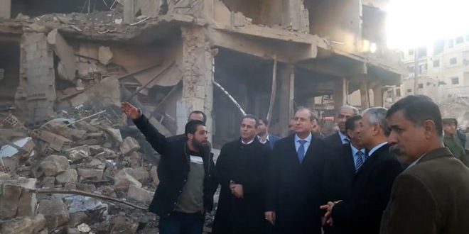 وبدأ الوفد الذي يضم وزيري الصحة الدكتور نزار يازجي والشؤون الاجتماعية والعمل ريمه قادري جولته بالاطلاع على عمل ورشات الترميم والإصلاح المنتشرة في المدينة إضافة لعدد من الأفران والمطاعم وعلى آلية توزيع مادة المازوت المنزلي واستمع من المواطنين إلى احتياجاتهم ومتطلباتهم.